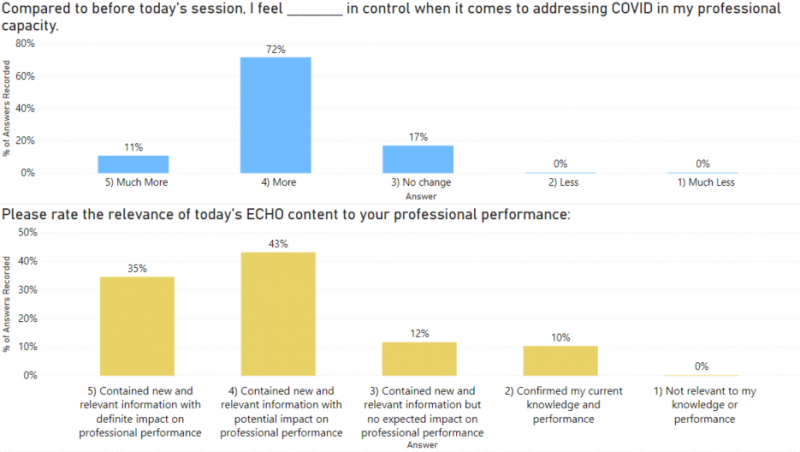 Each week as our sessions end, our Zoom chat box is filled with praise from participating providers, sharing the ways in which they’ve benefitted from that evening’s session. While we’re always honored by these impromptu moments of feedback, it is also important to our program that we’re more rigorously evaluating the experience and impact of the sessions. To that end, we began implementing Zoom polls at the end of each session to collect some of that information in-the-moment. The polls consist of two questions: 1. “Compared to before today’s session I feel __________ in control when it comes to addressing COVID in my professional capacity” with a 5-point Likert scale for participants to measure their feelings of control; 2. “Please rate the relevance of today’s ECHO content to your professional performance” with participants rating the content on a 5-point Likert scale.